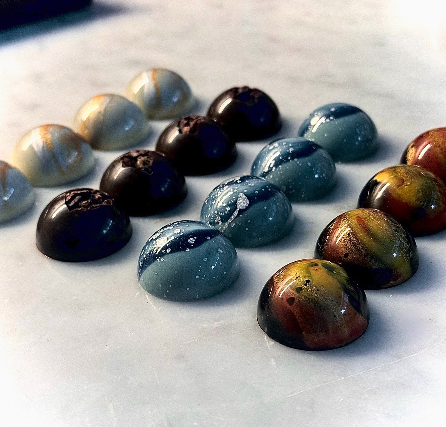 Die viele Techniken, an welchen Schokolade sich als Dankbarer Rohstoff zeigt, die man künstlerisch zum Ausdruck bringen kann, verwandeln kleine Pralinen in Prachtvollen Meisterwerke. So vereine ich das geliebte Handwerk mit der geehrten Kunst.